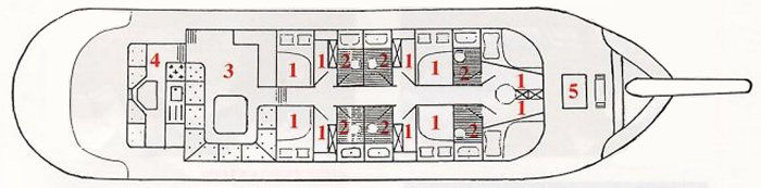 cabins 2. Passenger WC & shower 3. Saloon 4. Galley 5. Crew's quarters |